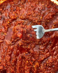 המטבוחה מוכנה כשהיא מגיעה למרקם ריבתי.